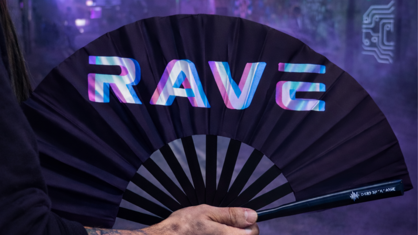Faltbarer Handfächer groß und stabil – Fächer Schwarz mit dunklem grünem Schimmer,, UV Glow, leuchtet im Dunkeln – Festival Rave Techno EDM Party Accessoires aus Holz und Stoff